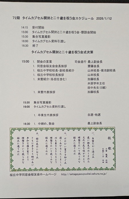 2026年1月12日 第15回目のタイムカプセル開封と二十歳を 祝う会を開催致しました 晴天の下、卒業生181名中 106名の方が参加され 先生方も加藤校長、井原学年主任、E組担当 田中先生が お見えに為り、卒業生と歓談しておりました 今回も多数の保護者の方、卒業生、そして昨年タイムカプセル式典に 参加された若い同窓会員も10名程、お手伝いに来て下さいましたが 我々と比べても50歳以上も若い方のエネルギーには歓心させられました 今年も同窓生で二次会を開くそうですが、余りお酒を飲みすぎない様に と心配しました 若い同窓会員の方々は手伝いもとても楽しいので時間があえば 又、お手伝いをしたいと言ってましたので期待してますよ! 本日、参加して頂いた方々、誠に有難う御座いました |